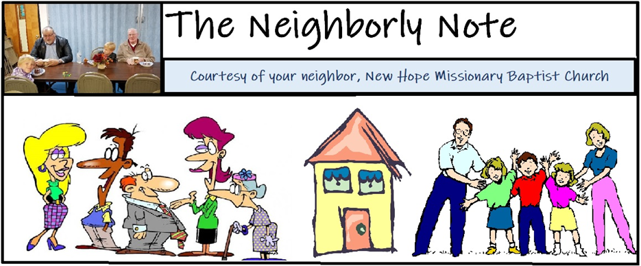 The Neighborly Note is a free quarterly newsletter published by New Hope Missionary Baptist Church to share the truths of God with all who might wish to know it and to share practical advice for Christian living based on the Bible. The newsletter is published in March, June, September and December. To read the newsletter, simply click on the link below.